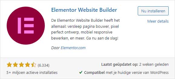 Uiteraard heb je een WordPress installatie nodig om hier überhaupt mee aan de slag te kunnen. Om Elementor Pro te kunnen installeren, moet de gratis versie van Elementor reeds geïnstalleerd zijn. Stap 1 is dus de de installatie van Elementor gratis welke te downloaden is in de WordPress repository binnen je WordPress installatie. Klik in de linker navigatie op “Plugins” en klik vervolgens op de button “Nieuwe plugin” en zoek daar op “Elementor”. Zodra je deze gevonden hebt kun je de plugin installeren.