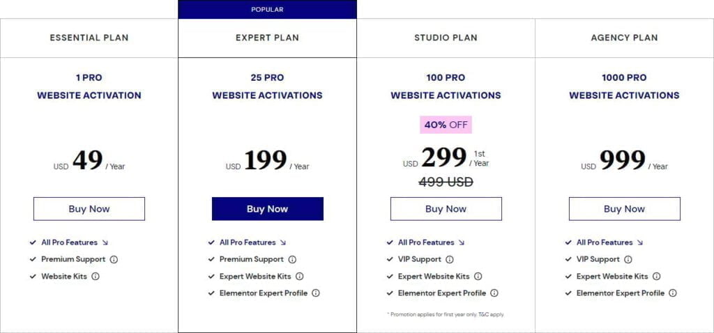 Internetbedrijven of freelancers hebben de keuze uit drie licenties. Heb je slechts een klein bureau en maak je zo nu en dan WordPress website voor je klanten? Dan kun je het beste voor het Expert Plan gaan. Met deze licentie kun je 25 WordPress websites maken met Elementor voor 199 dollar per jaar.